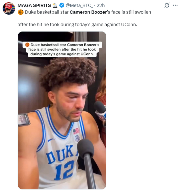 在NCCA疯狂三月精英八强赛中,卡梅隆-布泽尔全场比赛39分钟,21中10,三分4中1,拿到27分8篮板4助攻4失误2盖帽,命中率47.6%。但杜克大学在终场前6.5秒领先2分还手握球权的情况下,卡梅隆的弟弟凯登传球失误,最终康大的马林斯超远三分绝杀。